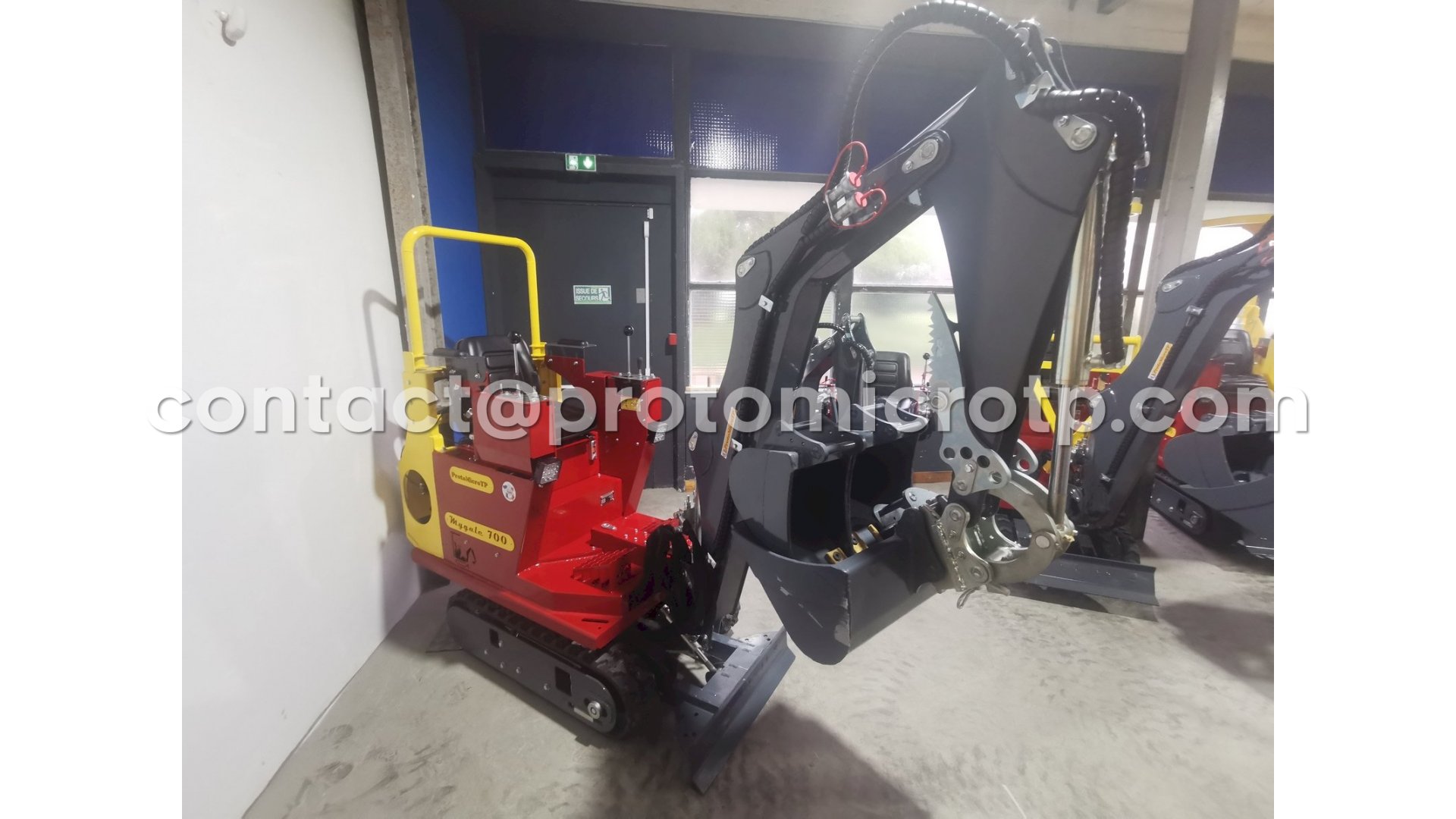 Issue de la série Mygale avec une largeur étroite de 830 mm, la Micro Pelle Mygale 700 est dotée d'une tourelle pivotant à 360° et d'un pied de flèche à 110° qui lui permet de travailler en déport, parfait pour les zones à proximité d'un mur. Elle est équipée d'une ligne hydraulique d'accessoires, d'une attache rapide pour les godets, d'un pouce mécanique, et est livrée avec des godets de 20 cm, 30 cm, un godet de 60 cm réversible, et une dent de dérochage, ainsi que des extensions de lame.